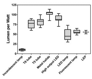 Biểu đồ thông số cho thấy rõ ràng rằng bóng đèn (sợi đốt) là nguồn sáng phát ra ít ánh sáng nhất trên mỗi Watt mà nó sử dụng (lumen trên mỗi Watt). Nó cũng cho thấy rằng ống T8 kiểu cũ cho ra gần như nhiều ánh sáng trên mỗi Watt so với ống T5 hiện đại hơn.