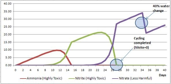 Khi chỉ số NO3 bắt đầu tăng thì số lượng vi khuẩn có lợi đã tích tụ trong hệ thống lọc đã ổn định. Nhưng khi nồng độ cao trên 20ppm thì NO3 sẽ trở thành chất độc. Vào ngày thứ 27 của chu trình, nồng độ NO3 đang bắt đầu tăng, khi đó bạn cần thay nước (khoảng 40% thể tích nước trong bể). Lượng nước mới sẽ làm giảm nồng độ NO3 được sản sinh ra từ quá trình.