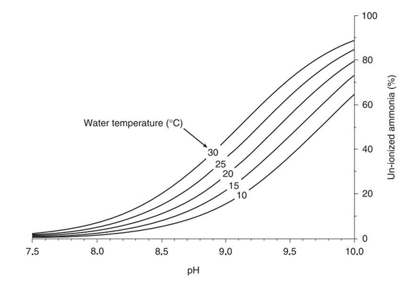 Trong điều kiện môi trường bể cá, cả hai đều bị chi phối với độ cứng của nước (pH) và nhiệt độ nước. Cụ thể, khi nhiệt độ cao hoặc pH trong bể lớn hơn 7 (nước có tính kiềm), nồng độ NH3 sẽ cao hơn nồng độ NH4+. Ngược lại, nếu nhiệt độ thấp hoặc môi trường nước có độ pH nhỏ hơn 7 thì NH3 sẽ được chuyển hóa thành NH4+. Tuy nhiên, độ mặn và mức độ ion hóa trong nước cũng ảnh hưởng đến nồng độ của chúng.