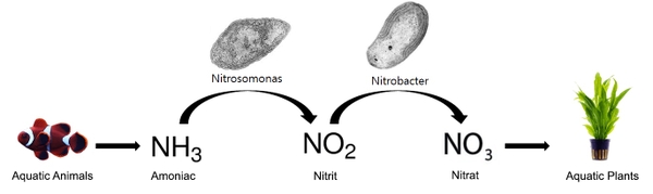 Chu trình bắt đầu ngay khi trong bể xuất hiện các vụn hữu cơ, sản phẩm thu được đầu tiên là Amoniac (NH3) và Amoni (NH4+). Các NH3 và NH4+ tích tụ là kết quả của sự phân hủy Ure và Protein (có trong thức ăn và phân của động vật) của vi khuẩn. NH3 là một loại khí độc có thể dễ dàng hòa tan trong nước, còn NH4+ là một loại muối chỉ độc khi ở nồng độ cao.![]()