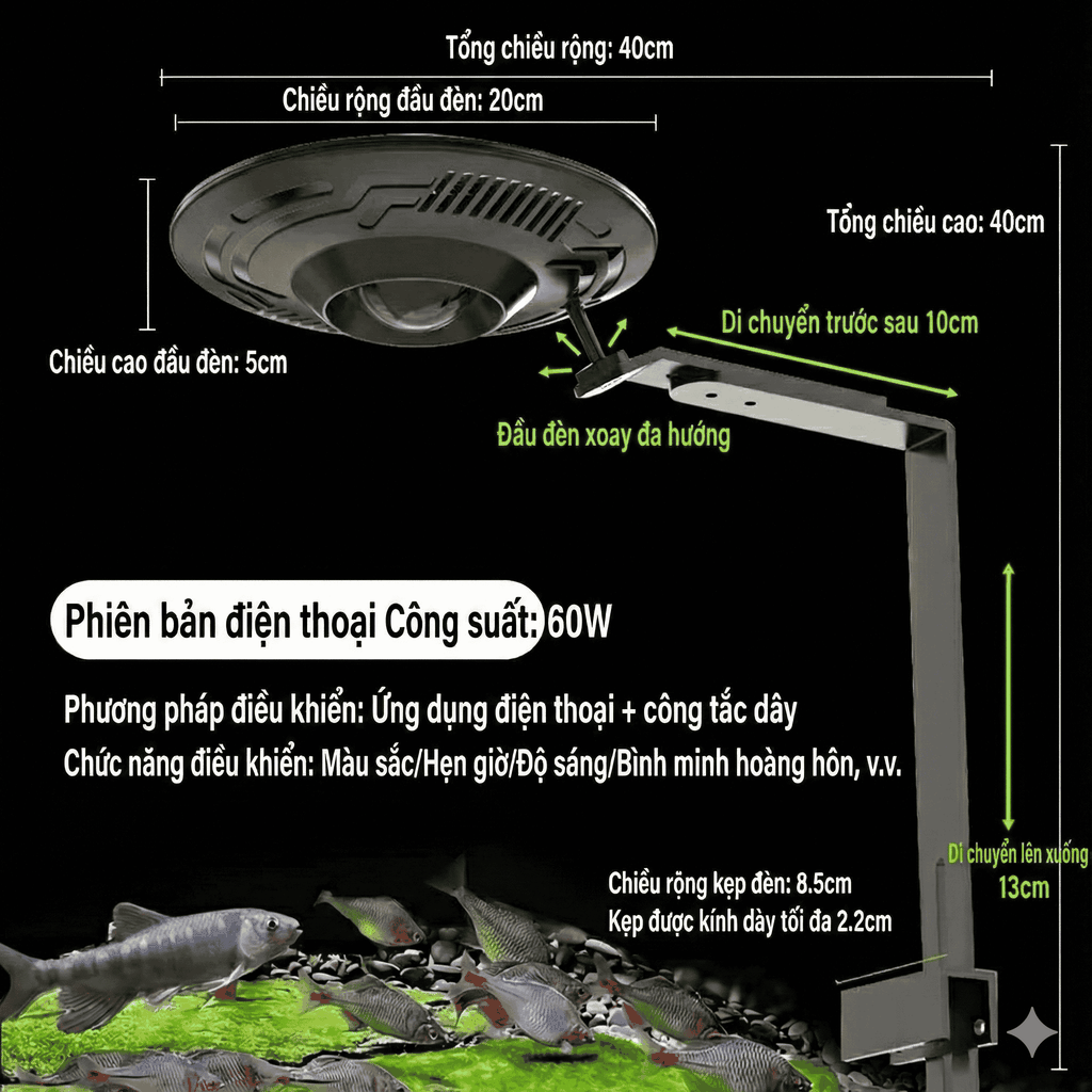 - Chân đèn cao, cho vùng chiếu rộng, phù hợp nhiều kích thước bể.