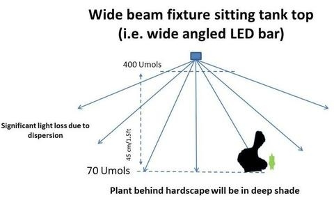 Điều quan trọng là sự phân bổ ánh sáng phải phù hợp với kích thích của bể. Do vậy tùy vào bố cục/ hardscape mà bạn có thể bố trí 1 – đến nhiều thanh led hay nhiều dãy bóng T5HO có khả năng cung cấp PAR tới mọi góc trong bể - không tạo quá nhiều bóng đổ để có một chiếc bể sinh động nhất.