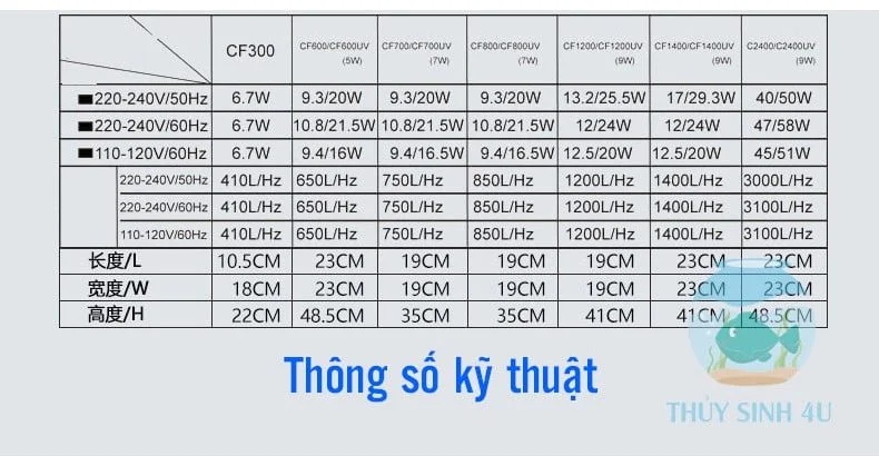 - CF800: Kích thước DRC: 20x20x37cm, Công suất: 9.3W – 850L/h – bể 60-80cm