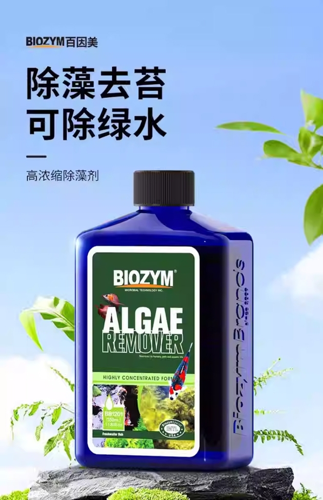 Mật độ quầng thể sinh vật nuôi trong hồ quá cao hoặc ánh sáng quá mạnh sẽ dễ dẫn đến sự sinh sôi của rêu tảo hại, làm cho nước có màu xanh lục và có rất nhiều rêu hại bám vào các dòng thực vật. BIOZYM - Algae Remover có thể nhanh chóng tiêu diệt rêu và tảo trong nước, khôi phục chất lượng nước trở nên trong hơn.